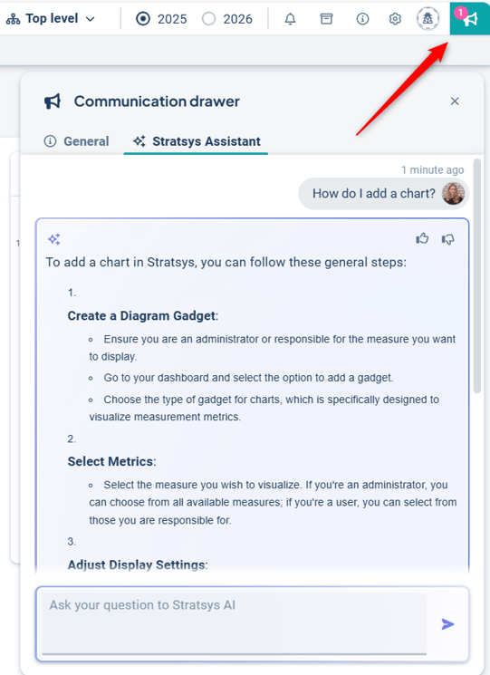 Navigate to the communication interface (the megaphone icon in the top right corner). You can always find it there, no matter where you are in Stratsys. Switch to the "Stratsys Assistant" tab and start asking your questions!
