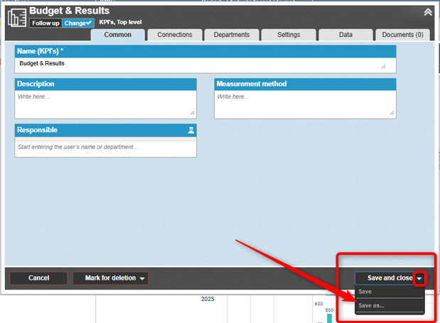 If you have existing information in your plans that you'd like to use as a foundation when adding something new, you can use the "Save As" function. This gives you a copy that you can then modify as needed—bringing over a number of settings automatically. This can be especially useful for indicators and measures that come with many configurations. Easy peasy!