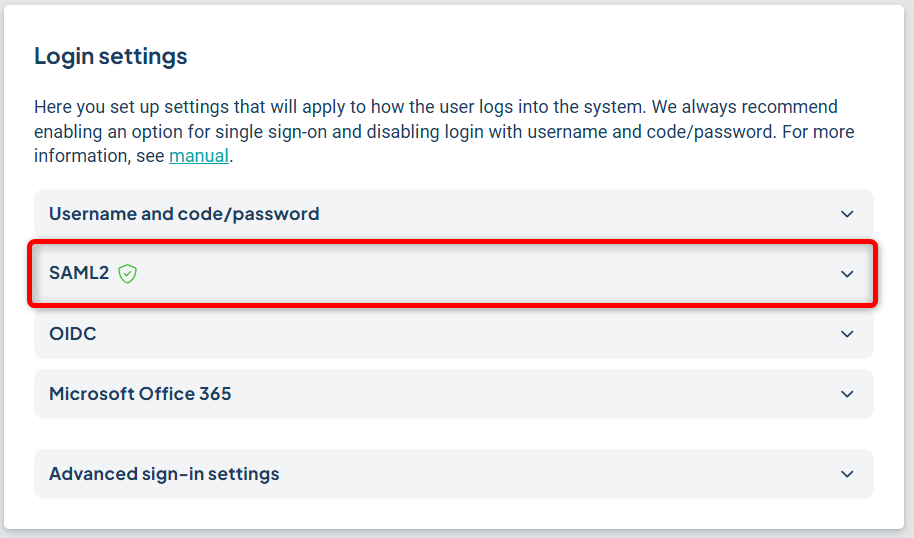 Under Login Settings, click on "SAML2 – Single sign-on".