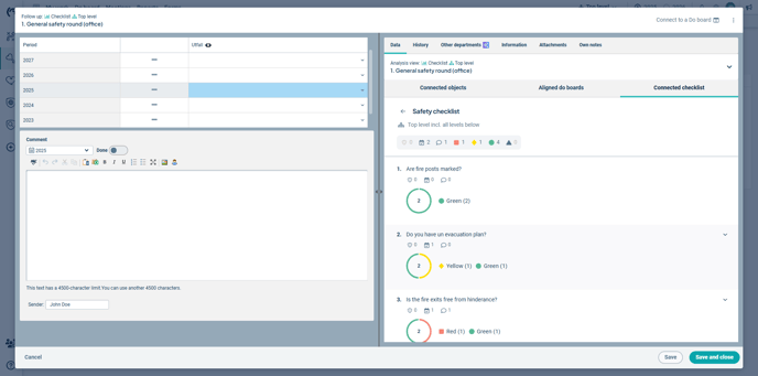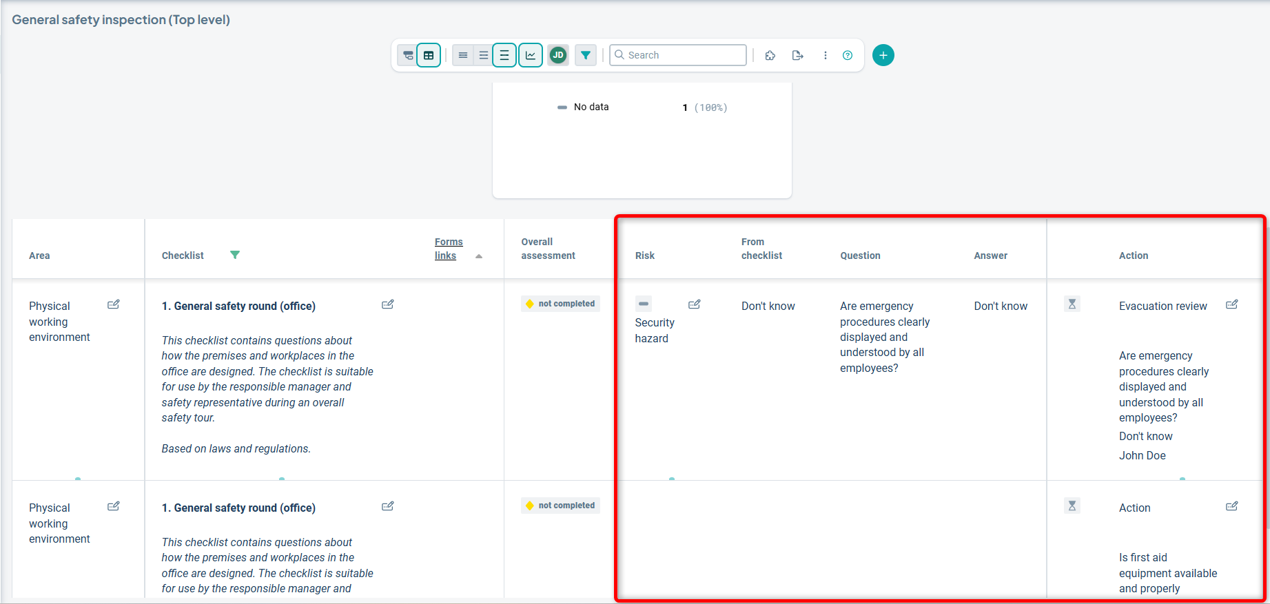Actions and risks created through the checklist are placed in the respective management model column at the reporting unit, linked to the same node as the checklist itself. If both a risk and an action are created for the same question, they will be linked together. Read about how administrators can configure the display of actions and risks: Configure Visualization of Forms Checklists.