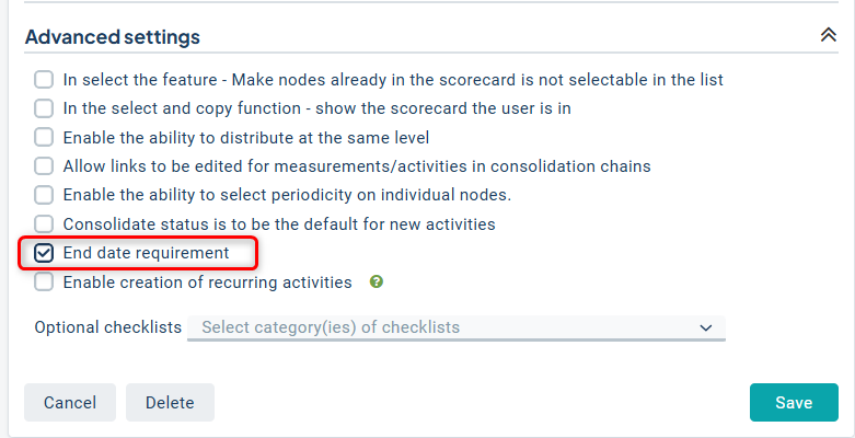 Tip for Administrators: For actions, it is possible to disable the requirement for an end date in the advanced settings of the scorecard column if desired.