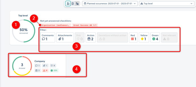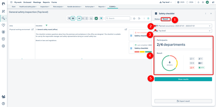 Choose which response round you want to view results from in the top dropdown, if multiple rounds have been completed. The default is the most recent. The “planned occurrence” show results from all units that received the checklist. If there are responses reported outside of the planned occurences, this is indicated with a date. In that case, responses are shown only from the relevant unit.