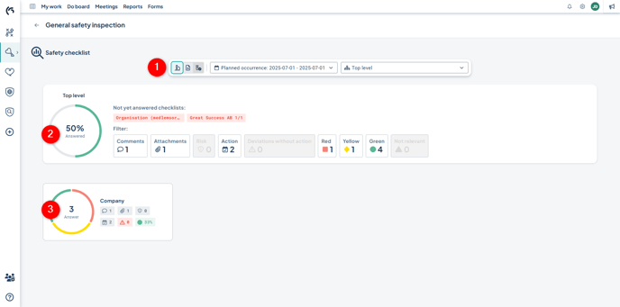 On the far right, you can see how many have responded Yes / Partly / No to each question. By expanding with the upper arrow (1), you can see which units submitted that response.