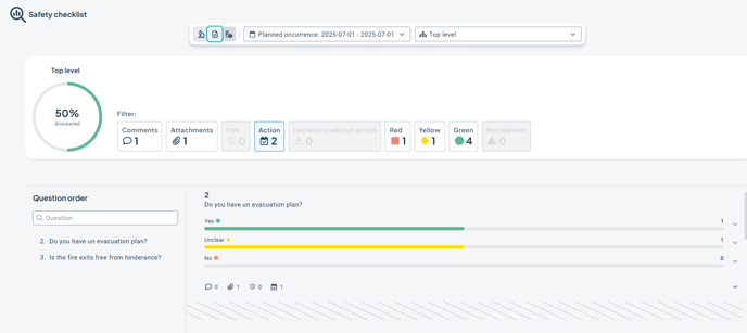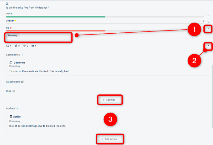 By expanding with the lower arrow (2), you can view actions, risks, comments, and attachments. You can also add actions and risks to the question here if you believe any are missing.