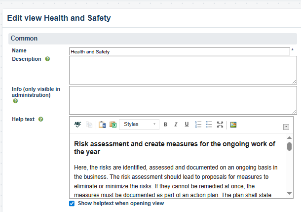 Under General, you can specify the name and various descriptions. Help text is managed from the communication area – see the following article: Help Texts in the New View Type