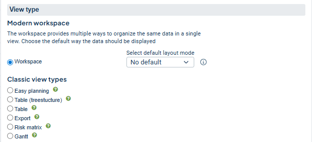 The areas where information can be displayed and edited are called views. This article describes the settings available for the new workspace, which, unlike classic view types, includes multiple display modes.