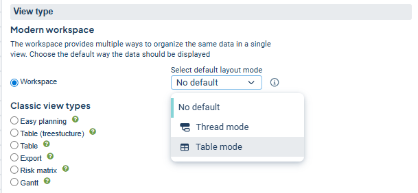 To update a classic "Tree – drag and drop" view to the modern interface, change the display mode to "Workspace" for the classic view and set 'Thread Mode' as the default.
