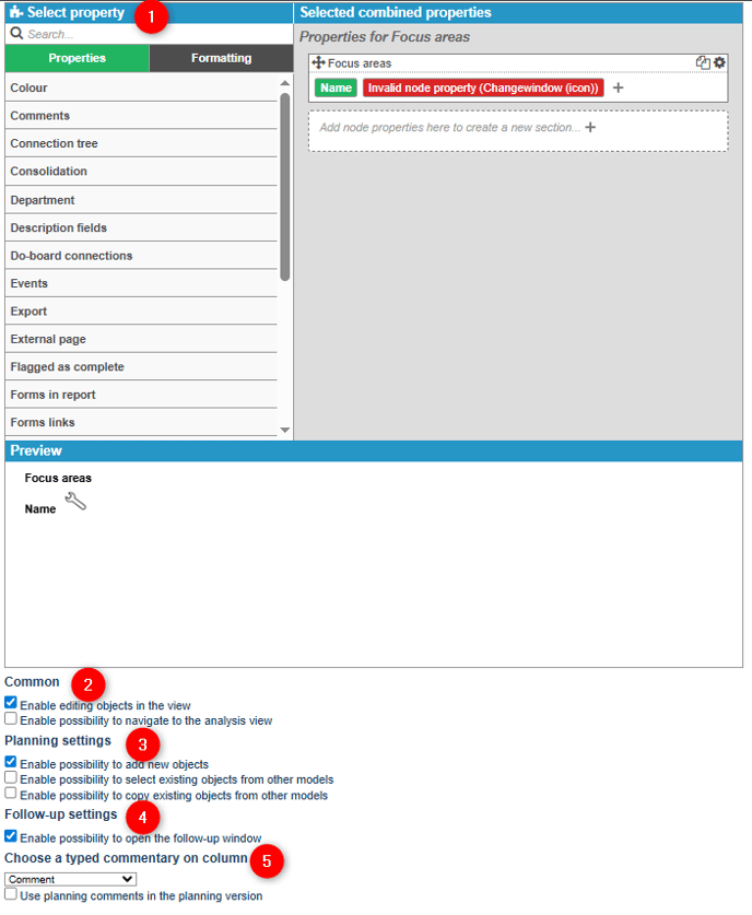 At the top, the properties to be displayed for the object in the view are shown. Read more about object properties. If you have converted a classic view to the new view type, some properties will appear in red and be marked as invalid. These can only be removed.