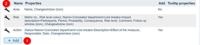 All columns from the management model can be added for display in the view. If not all columns have been included yet, an "Add" button will be displayed below the column list (1). Click this and select the column you are missing in the view. Then make the desired column settings.