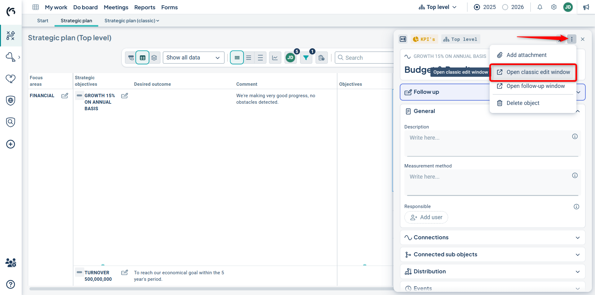 If you switch to the classic edit window for the new view type, you will access the Edit and Follow-up windows via the context menu (three dots). It is therefore not possible to click directly in the view to open these windows with this setting.