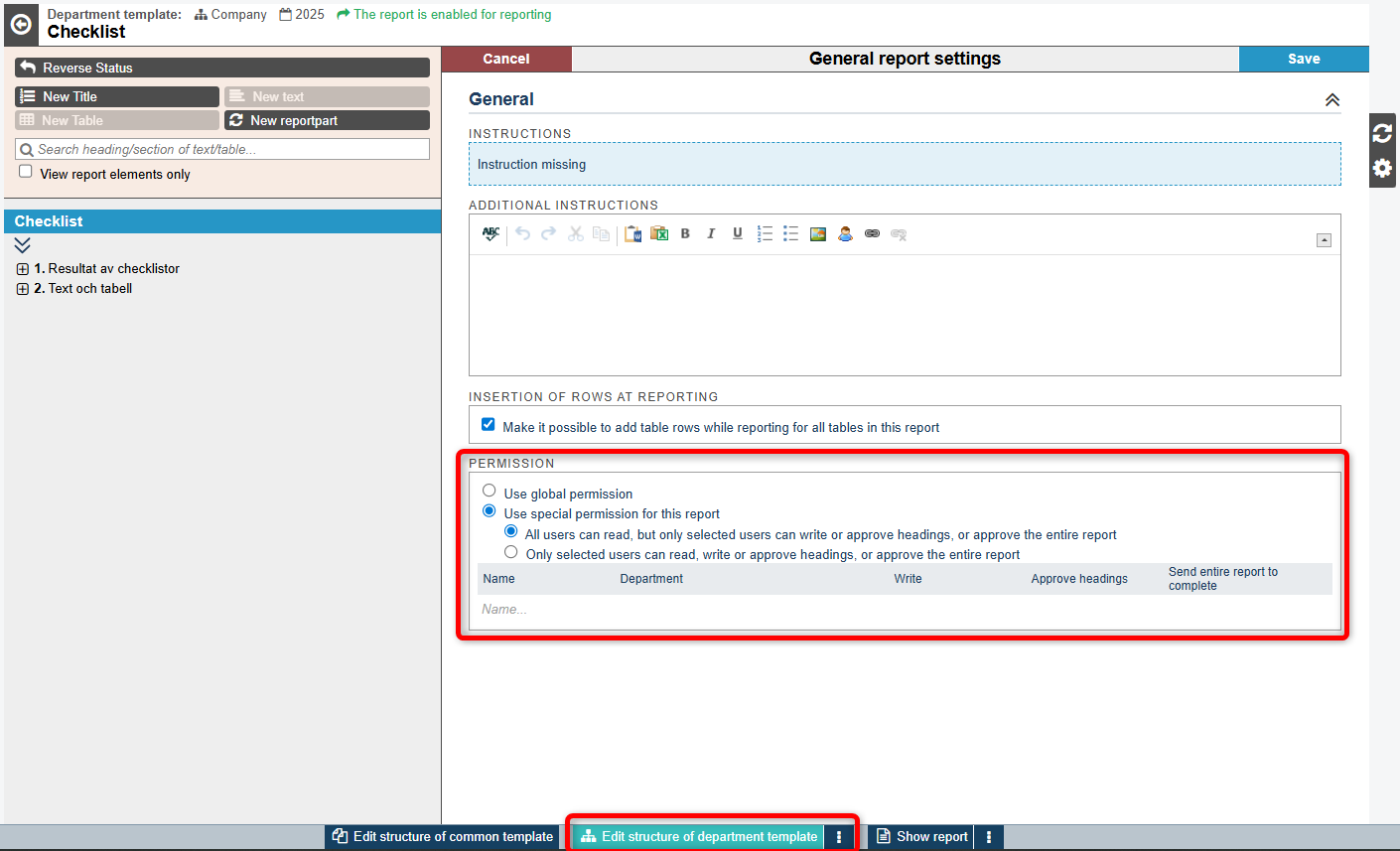 Through “Edit structure of department template” you can configure individual headings to require specific permissions in order to be read and/or edited. Permissions are assigned per heading and user, and you can control the ability to Write, Approve headings, and Submit the entire report as complete.