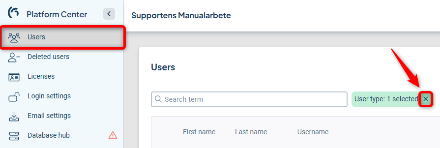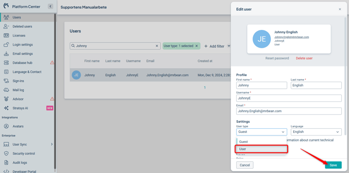 3) Locate the user and change the user type to User, then save (if you can't find the user here, your issue is caused by something else).