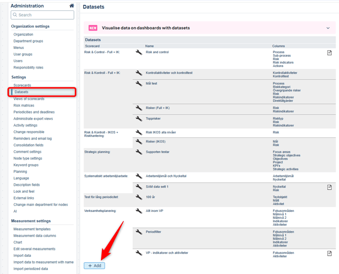 As a Full Administrator, go to Datasets under the administration section Settings. Click Add to create a new dataset.