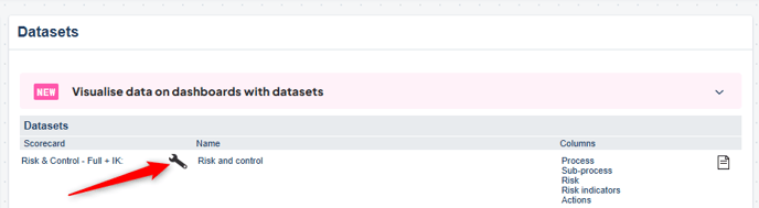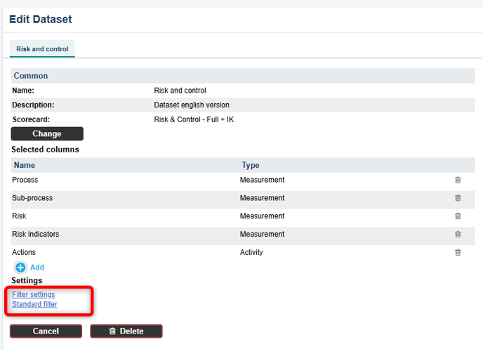 After saving your Dataset, you can modify its properties. For example, you can create filters to extract the specific information you want included in the data selection. Just like in views and report sections, you have access to filter settings and a standard filter to define your selection. Click the wrench icon to access the filter settings.