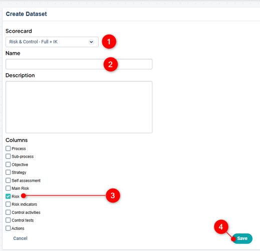 Select the scorecard (1), give your dataset a clear name and an optional description, and choose which scorecard columns to include (3). Then click Save (4).