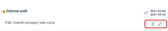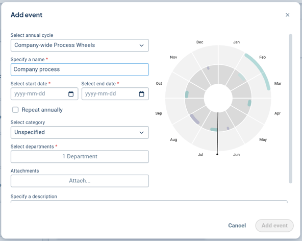 Add, edit, and delete events distributed across units and subordinate units where you have permission. Note that changes will apply to the entire organization, even if you make them in a gadget that is only visible to you. This applies both on the "My work" start page and on any product dashboards where annual wheels are present.