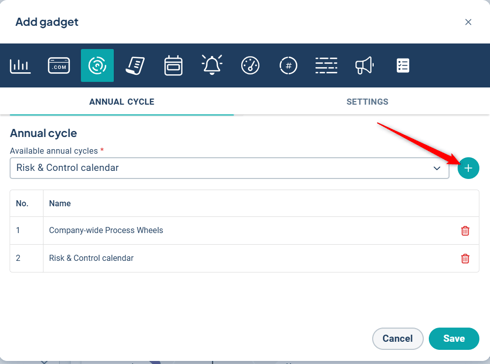 Start by selecting which annual wheel(s) you want to display. You can visualize up to three unique annual wheels in the same gadget. Choose from the available annual wheels in the list and add them to the gadget by clicking the plus sign next to the list: