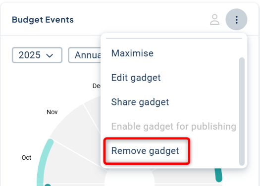 To delete a gadget with an annual wheel, go to the three-dot menu (context menu) in the upper right corner of the gadget. Then select "Remove gadget"—you may need to scroll to find this option. Confirm that you want to proceed with the deletion.