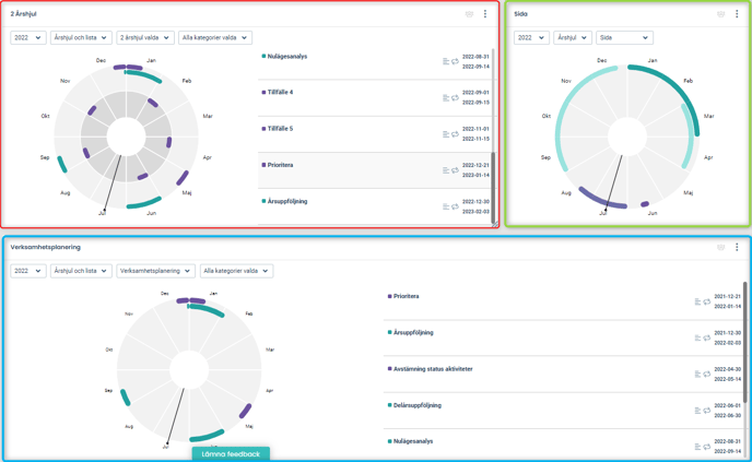 The images below show three examples of how multiple annual wheels can be set up on the same dashboard in different sizes. Larger annual wheels can display more information about upcoming events (list view).