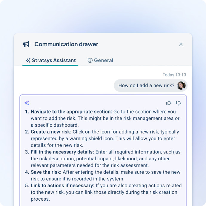Yes, the activation of Stratsys AI for generating suggestions and summarizing reports can be configured for specific products and sections of the platform — for example, only within risk management or strategy follow-up.