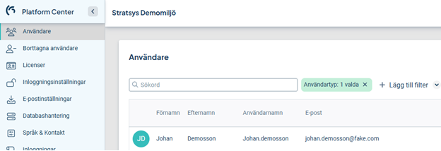Notera: En ny användare i DD måste både läggas till i både i Platform och i DD. Stratsys plattform hanterar själva inloggningen, medan DD styr behörigheter och roller.