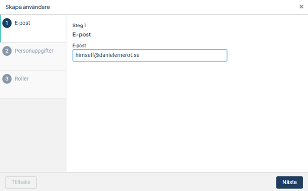 Fyll i användarens e-postadress (Stratsys-adresser kan inte användas). Klicka sedan på “Nästa”