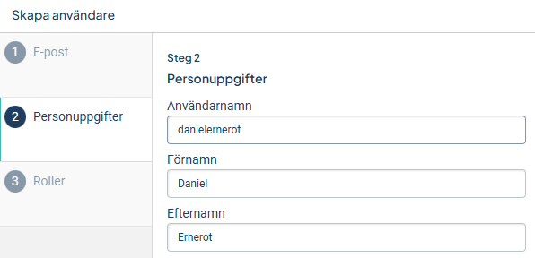 Välj e-postadressen för den användare du skapat i Platform administration. För- och efternamn fylls då i automatiskt.
