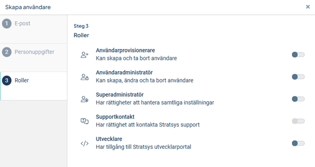 Notera: Dessa roller avser roller i Stratsys-plattformen, inte i DD. Dessa ställs in specifikt på användarnivå i DD.
