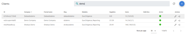 För att redigera ett kundkonto går du först till Clients i administrationsmenyn. I listan som visas hittar du alla kundkonton som du har åtkomst till, och listan är sökbar för att underlätta. Klicka sedan på penn-ikonen för att öppna inställningarna. Från den här platsen kan du också logga in i kundkontot med ett internt supportkonto.