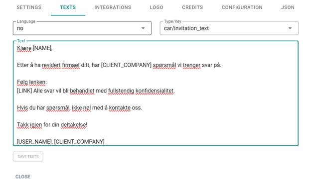 Här kan du göra anpassningar av kundanpassade mallar för texter som primärt används för olika utskick till användare och leverantörer. Varje text identifieras med typ och en nyckel. “car/invitation_text” är exempelvis e-postmallen för CAR-inbjudningar.