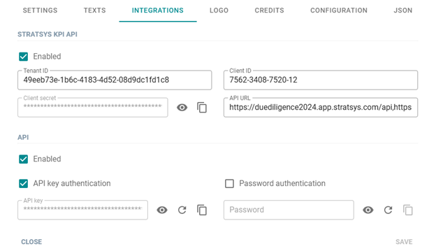 Här aktiverar du och anger inställningar för kopplingen till Stratsys (automatisk uppdatering av nyckeltal för strategisk uppföljning) samt API-åtkomst.