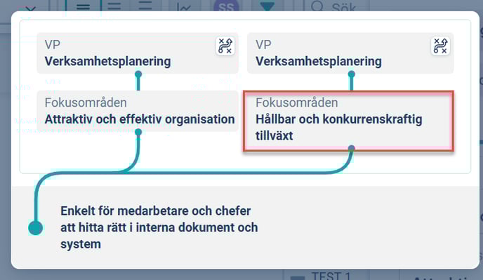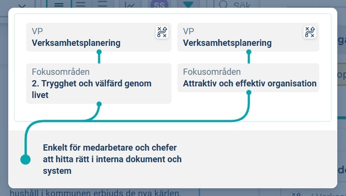 - Lägg till koppling - Ni arbetar med mål i flera produkter, exempelvis i både Systematiskt arbetsmiljöarbete (Arbetsmiljömål) och i er Verksamhetsplan. Ibland kan ett och samma mål vara relevant för flera produkter, möjlighet finns då att addera en ytterligare koppling. På så vis kan ni arbeta med ett och samma mål i flera produkter och slippa skapa dubbletter och göra dubbla uppföljningar på olika platser. Ett mål kan i det här fallet bytas ut mot en risk, ett nyckeltal, en aktivitet eller vad som. Ett objekt skulle också kunna ha dubbla kopplingar inom en produkt för att exempelvis visa att den här aktiviteten hjälper oss framåt i arbetet med både mål 1 och mål 2.