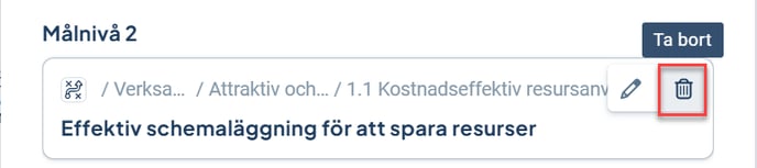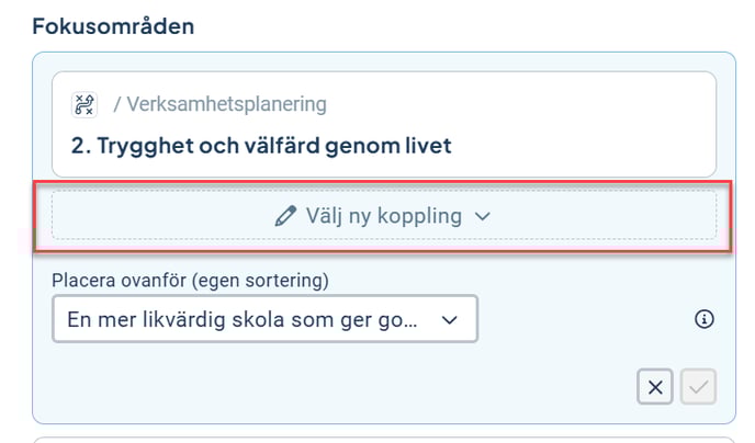 - Ändra koppling - Ett objekt är kopplat till ett objekt som ska tas bort i planeringen, ex en aktivitet som är kopplad till ett mål. Ni önskar dock arbeta vidare med aktiviteten. Istället för att ta bort befintlig aktivitet och lägga till en ny kan man enkelt koppla om aktiviteten till ett nytt mål. På så vis hålls exempelvis historiken intakt, och givetvis sparar ni också tid på att slippa skapa aktiviteten på nytt.