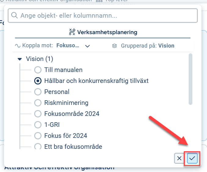 Välj rätt objekt genom att använda fritextsökningen eller bläddra i listan. Bocka i det objektet du önskar att göra kopplingen gentemot, och tryck på bocken i det nedre högra hörnet för att spara. Dialogen kommer därefter att stängas.