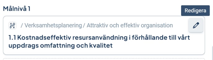 Notera! Textobjekt blir inte unika kopior när de fördelas ut i organisationen så ändrar eller tar du bort en koppling så påverkar detta objektet på alla ställen dit det är fördelat då det är samma objekt som är synligt överallt. För mått- och aktivitetsobjekt blir ett fördelat objekt en egen unik kopia så för de objektstyperna är det möjligt med unika kopplingar på olika nivåer i en organisation.