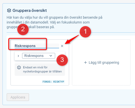 2) Klicka på "Lägg till gruppering", och välj sedan den kolumn som du vill ha som fokus för grupperingen. Du väljer bland alla kolumner som finns i modellen. Om du exempelvis vill att arbetsytan ska visa en översikt av risker väljer du risker i detta steg. I praktiken väljer du vad som ska visas först i tabellen direkt under grupperingsraden. Det går att gruppera på upp till tre nivåer.