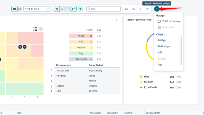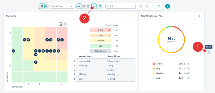 Begränsning: Stöd för filtrering saknas i dagsläget. - Riskmatris: Tillgänglig om det visas riskmått i vyn, och visar då riskernas placering i matrisen. Har stöd för filtrering.