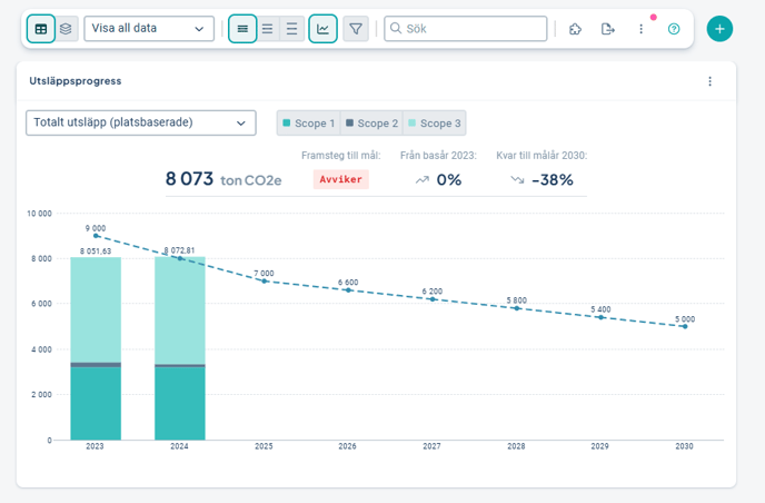 - Gadget för emissionsdata: Tillgänglig i Hållbarhetsprodukter som har mått med formel Basår. Används för att visualisera emissionsdata för CSRD Sustainability Management. Har stöd för filtrering.