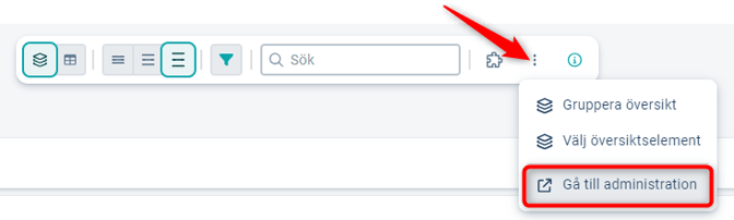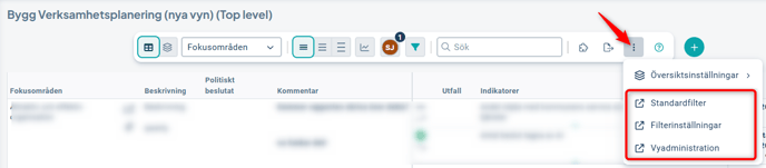 Du som är fullständig administratör eller styrmodellsadministratör hittar snabblänkar till vyinställningar, standardfilter och filterinställningar i trepricksmenyn längst till höger i verktygsfältet över vyn.