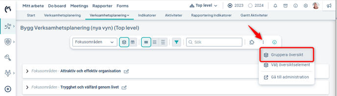 1) Välj "Gruppera översikt" som du hittar i kontextmenyn (tre prickar) längst till höger i verktygsfältet: