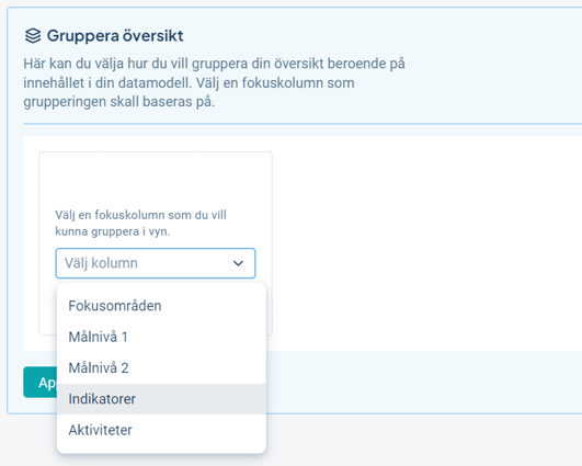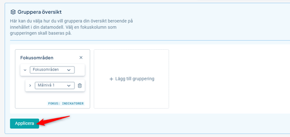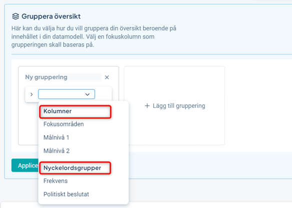 3) Välj sedan vilken gruppering du vill ha för ditt valda fokus. Du kan välja att gruppera på en kolumn eller en nyckelordgrupp. För kolumner kan du ha två nivåer för grupperingen, för nyckelordsgrupper endast en nivå. Klicka på Applicera.