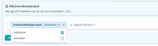 Klicka på "Lägg till element" och välj ett av de tillgängliga elementen. I exemplet väljer vi statusfördelning för indikatorer: