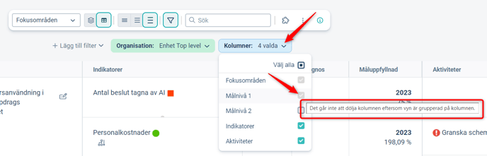 Om en gruppering inkluderar en viss kolumn, går denna inställning före eventuella filtreringar på kolumner. Kolumner som ingår i en gruppering kommer alltså alltid visas även om Standardfiltret har filtrerat bort den.