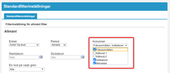 "Målnivå 1" kommer också alltid att visas trots att Standardfiltret inte visar den i detta fall: