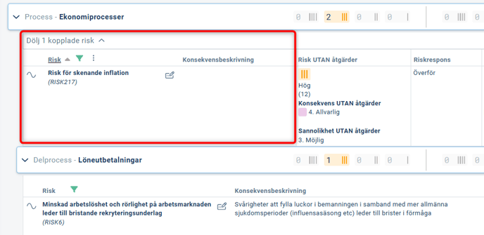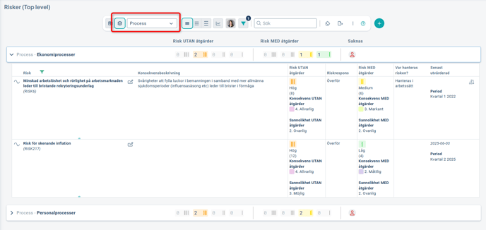 I detta fall visas även risker som är kopplade mot första grupperingen (Process) direkt under den grupperingen. Du kan välja att Visa eller Dölja objekt med denna typ av direkt koppling när du grupperar på två nivåer: