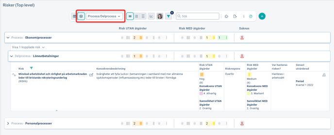 Exempel 1: Fokus på Risk, gruppering på kolumn Process utan undernivå: