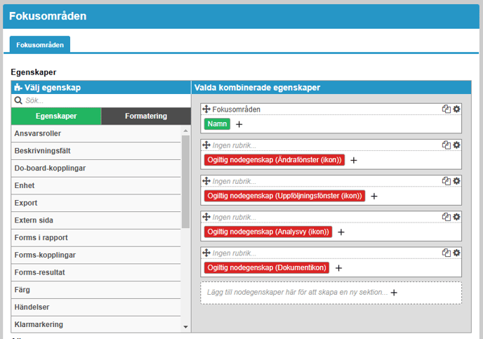 Exempel: Du vill visa övergripande progress för hur ni ligger till med era "Fokusområden". Du väljer därför in egenskapen på "Fokusområden" som är placerad till vänster i arbetsytan.