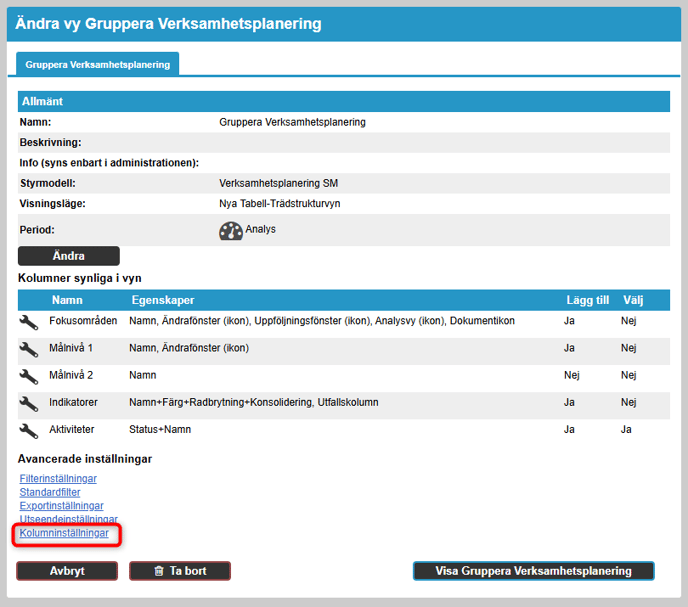 Vissa egenskaper i klassiska vyer ställs nu istället in via kolumninställningarna i den nya arbetsytan. Detta gäller: