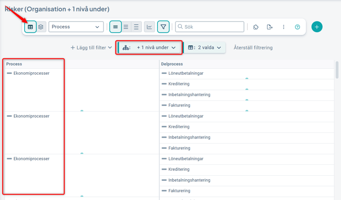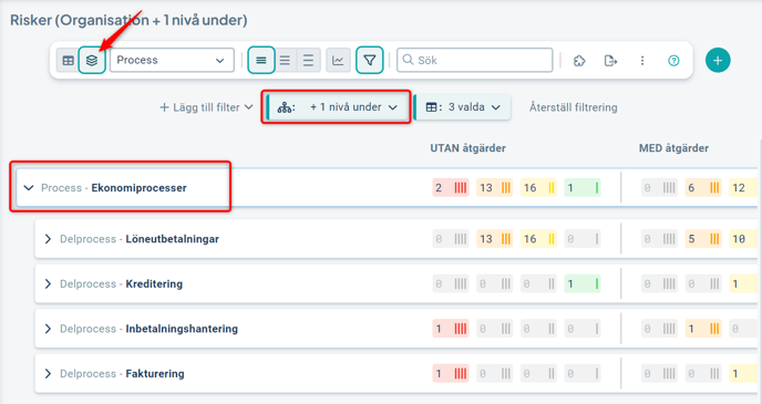 Vid byte till grupperingsläget, i exemplet med fokus på Risk och grupperat på Process och Delprocess, visas endast en grupp per process även vid filtrering på underliggande enheter.