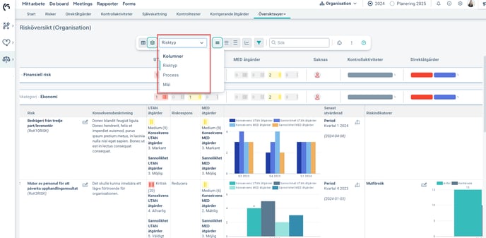 Du kan lägga till flera grupperingar och ha olika fokuskolumner för respektive gruppering. Exempelvis vill du kanske visa översikt över risker gentemot processer och delprocesser i en gruppering samt åtgärder gentemot mål och strategier i en annan gruppering.